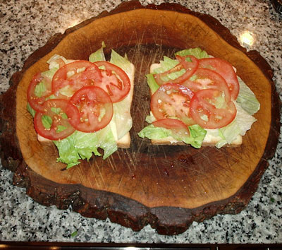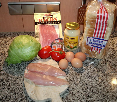 2 Hähnchenbrustfilets, 4 Scheiben Frühstücksspeck, 1 Tomate, 4 Scheiben Sandwichtoastbrot, etwas Mayonaise, 2 Eier, Eisbergsalat