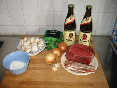 2 Flaschen Bier, 2 Zehen Knoblauch, Fleischbrühe, 600 g Rindfleisch (idealerweise
