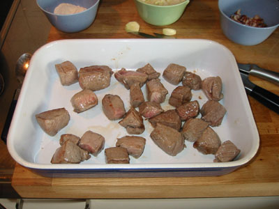 Alles kleinschneiden, die Fleischstücke sollten ungefähr eine Kantenlänge von 3