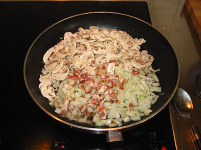 Die Champignons, den Speck, die Zwiebeln und später den Knoblauch kurz