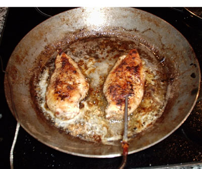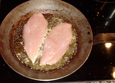 Die Hähnchenbrustfilets mit Salz und Pfeffer würzen und in Butter goldbraun braten