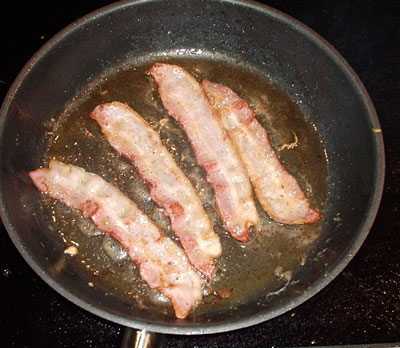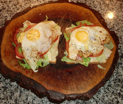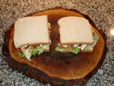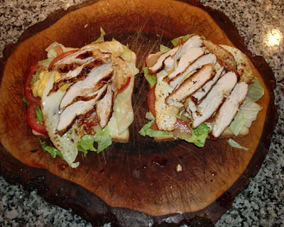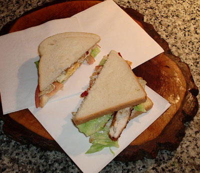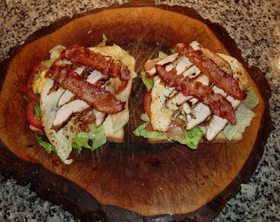 2 Hähnchenbrustfilets, 4 Scheiben Frühstücksspeck, 1 Tomate, 4 Scheiben Sandwichtoastbrot, etwas Mayonaise, 2 Eier, Eisbergsalat