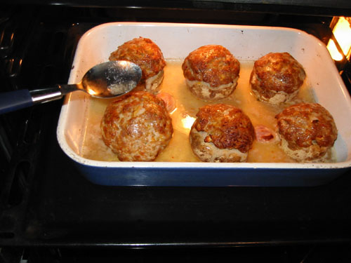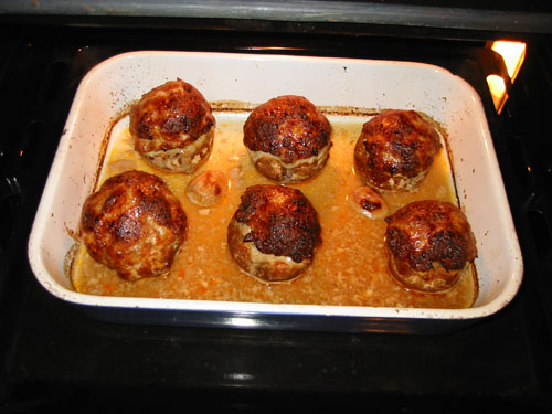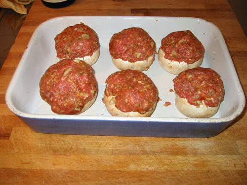 Soviel Hackfleisch wie möglich auf die Pilze geben, wir lassen ja nix verkommen