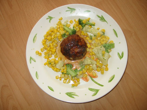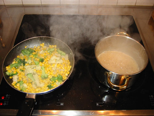 Brokkoli mit Blumenkohl und Mais gemischt, etwas Sahne und Brühe dazu,