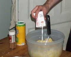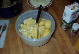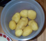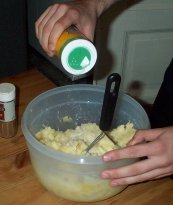 Kartoffeln und zerstampfen sie. Dem Teig geben wir je nach Geschmack Milch, Salz