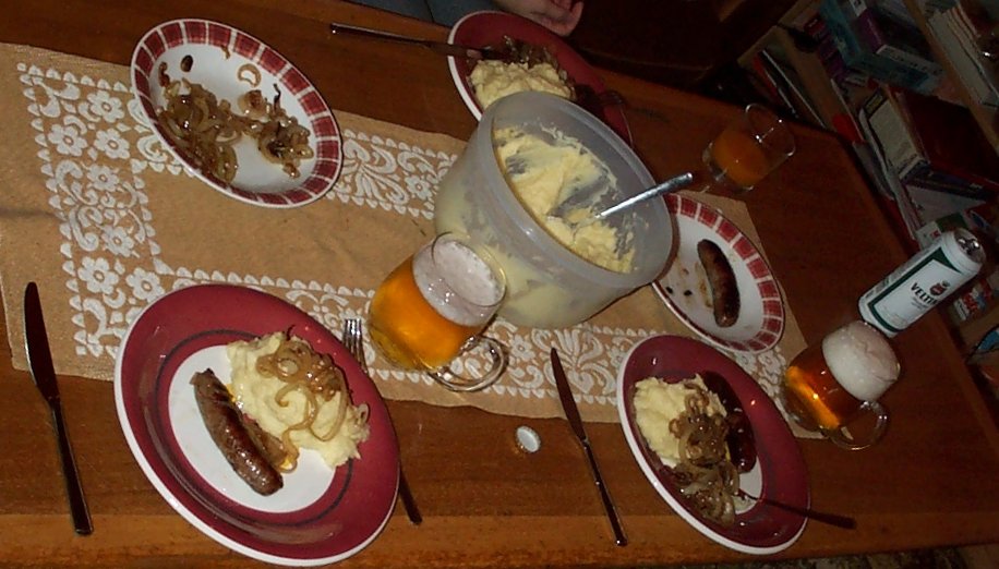 fertig. Auch Würste und Zwiebeln sollten jetzt fertig sein.