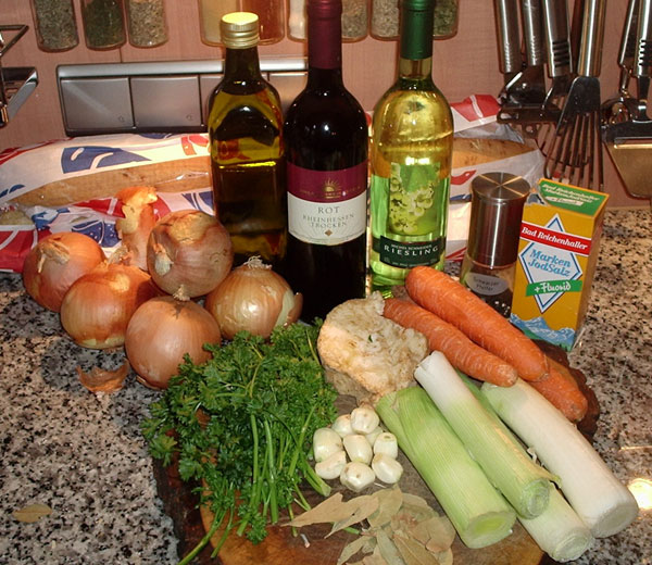Zwiebeln in halbe Ringe schneiden, Lauch in Ringe schneiden, Karotten stiften, Knoblauch grob hacken, Petersilie grob hacken, Sellerie in kleine Würfel schneiden, beide Weine öffnen und probieren.