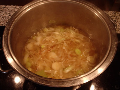 Los geht´s! Wir beginnen mit dem Sud für die Miesmuscheln westfälisch. Zwiebeln kurz in Olivenöl andünsten