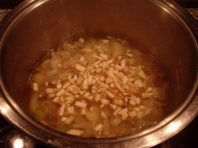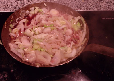 den Lauch zugeben, nochmal kurz durchmischen, ganz leicht andünsten.