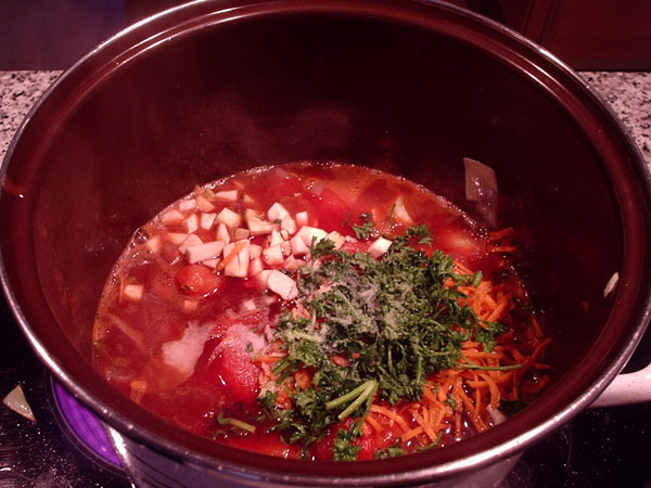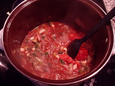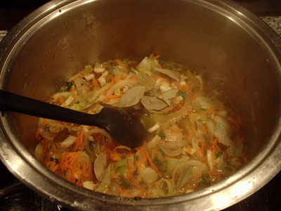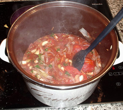...rein in einen hohen Topf, beide Dosen Tomaten mit Saft dazu, Petersilie, Sellerie, Knoblauch, die Karotte dazu, mit Pfeffer, Gemüsebrühe, Salz und Tabasco abschmecken, einige Lorbeerblätter zu, köcheln lassen