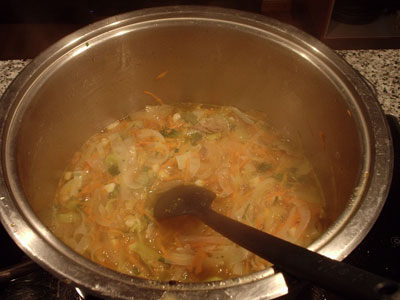 Alles in einen Hohen Topf geben, mit etwas Gemüsebrühe auffüllen,