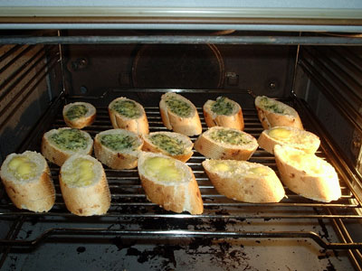 In der Zwischenzeit die Baguettes aufschneiden und die Scheiben mit Knoblauch- bzw Kräuterbutter bestreichen, in den vorgeheizten Ofen knusprig backen: