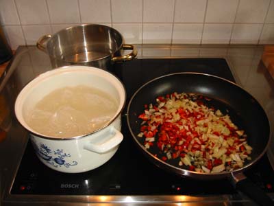 Den Reis kochen, parallel dazu die gewürfelten Zwiebeln und Paprika anschwitzen.