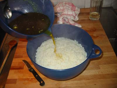 geleert hat), Fleischbrühe und Safran anrühren und damit den Reis übergießen.