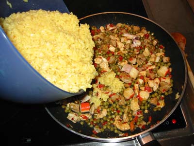 Den Reis mit allem in die Pfanne geben und gut verschütteln.