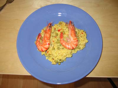 Nach 2 Minuten sind sie gar und können auf der Paella drapiert werden. Je nach