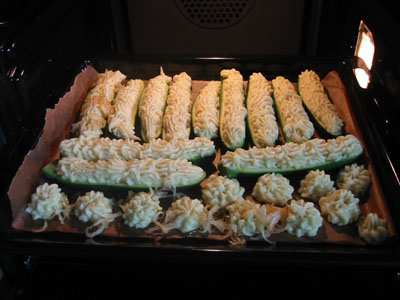 Als alternative Beilage Zucchini gefüllt mit Zwiebel-Kartoffelpüree und