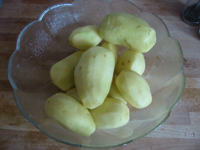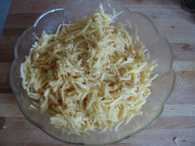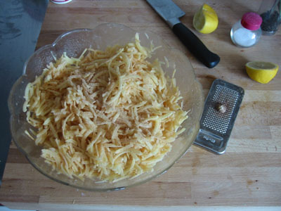 Die Kartoffelmasse mit Salz, Pfeffer, viel Muskat würzen und Mehl und Eier