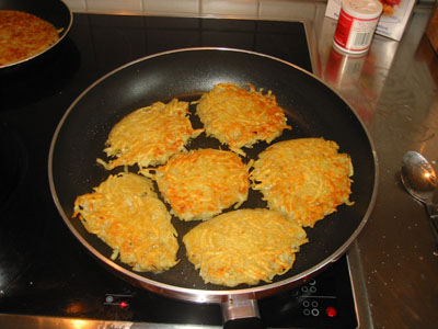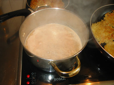 Und rein in die Pfanne. Bei nicht allzu großer Hitze mind. 15 Minuten brutzeln