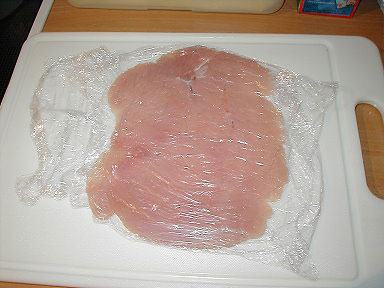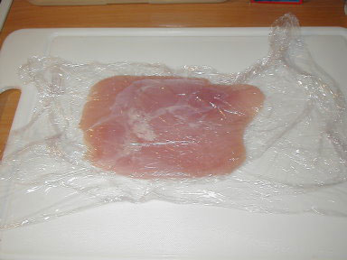 Schnitzel zwischen 2 Blatt Frischhaltefolie plattieren