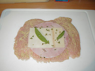 mit Schinken und Käse belegen, Thymian(Sparsam) und Salbei darauf verteilen
