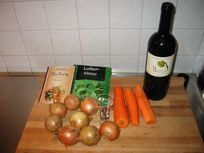 erstes werden wir eine Beize zubereiten. Dafür brauchen wir Zwiebeln, Karotten,