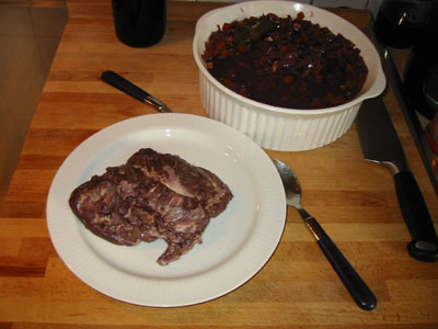 Rotwein, Lorbeer, Nelken und einen Schwung Pfefferkörner. (im Jägermeisterglas).