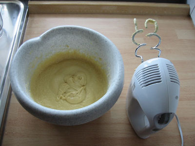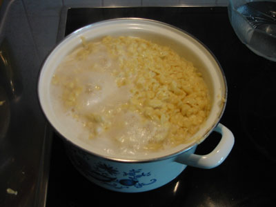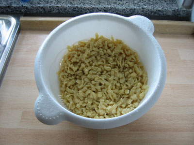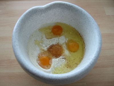 Man nehme 4, Eier, 500 g Mehl, 1/8 l Wasser und Muskat und Salz: