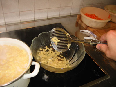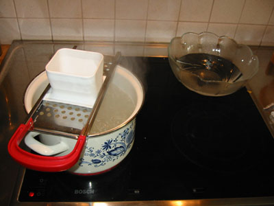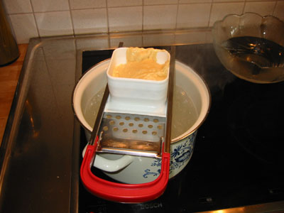 Über das gesalzene und kochende Wasser legen und dann den Teig in die