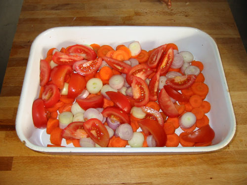 Das Gemüse klein schneiden und in eine feuerfeste Form geben.
