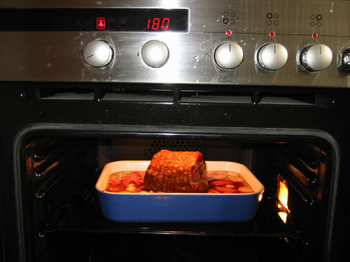 Nach einer Stunde den Braten auf einen Teller stellen.