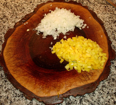 Die Zwiebel und die Paprika würfeln