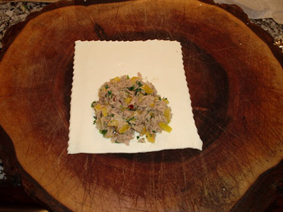 Den Blätterteig mit Hilfe eines Teigrollers oder wie das Teil heißt, in so große Stücke unterteilen, dass man auf einer Hälfte gut einen Esslöffel der Thunfischmasse unterbringen kann, ohne dass was daneben geht.